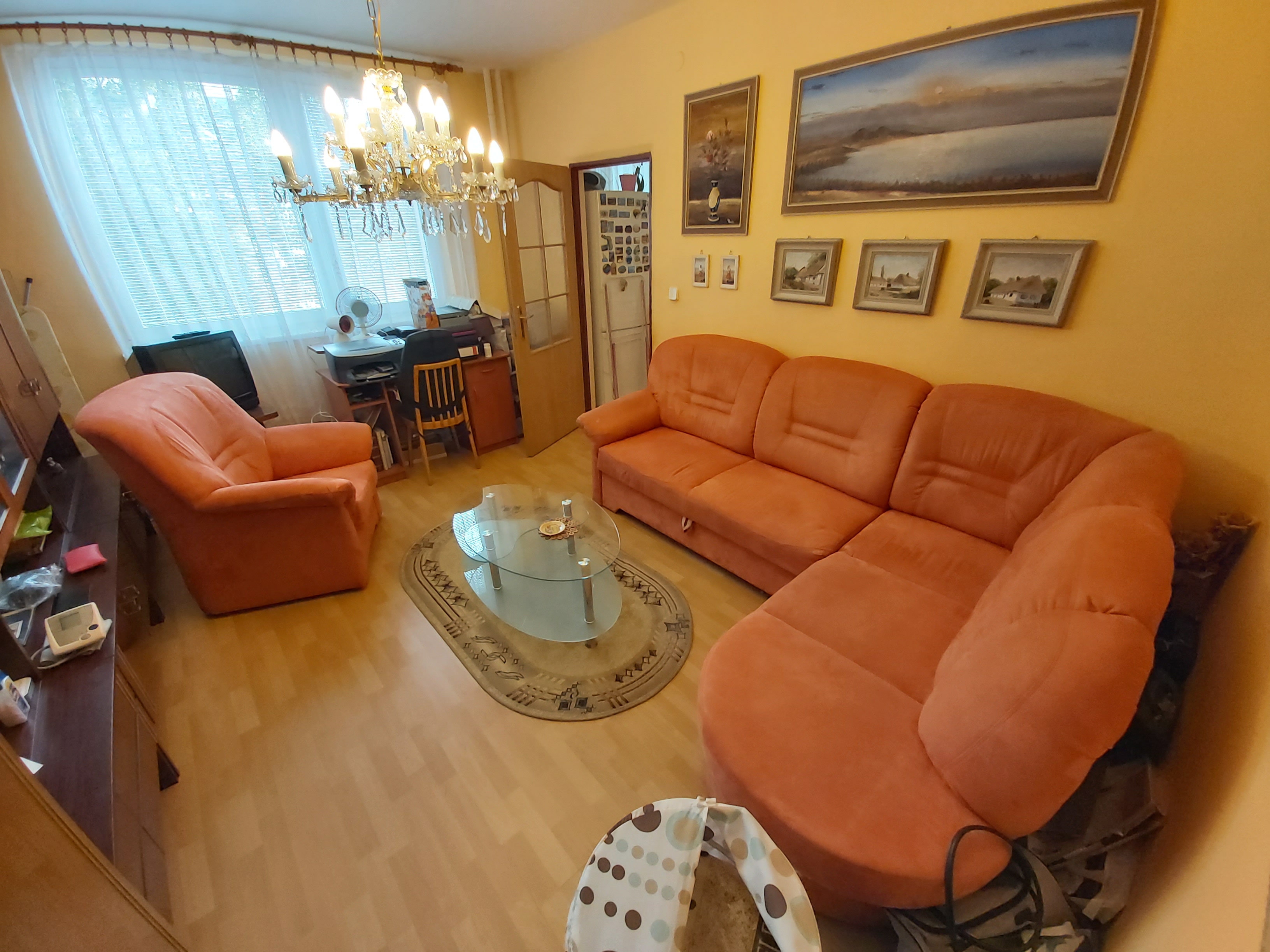 • V cene bytu je okrem kuch.linky, rohová sedačka, sektorová stena, v izbe posteľ a skriňa. Byt má balkón na medziposchodí.
